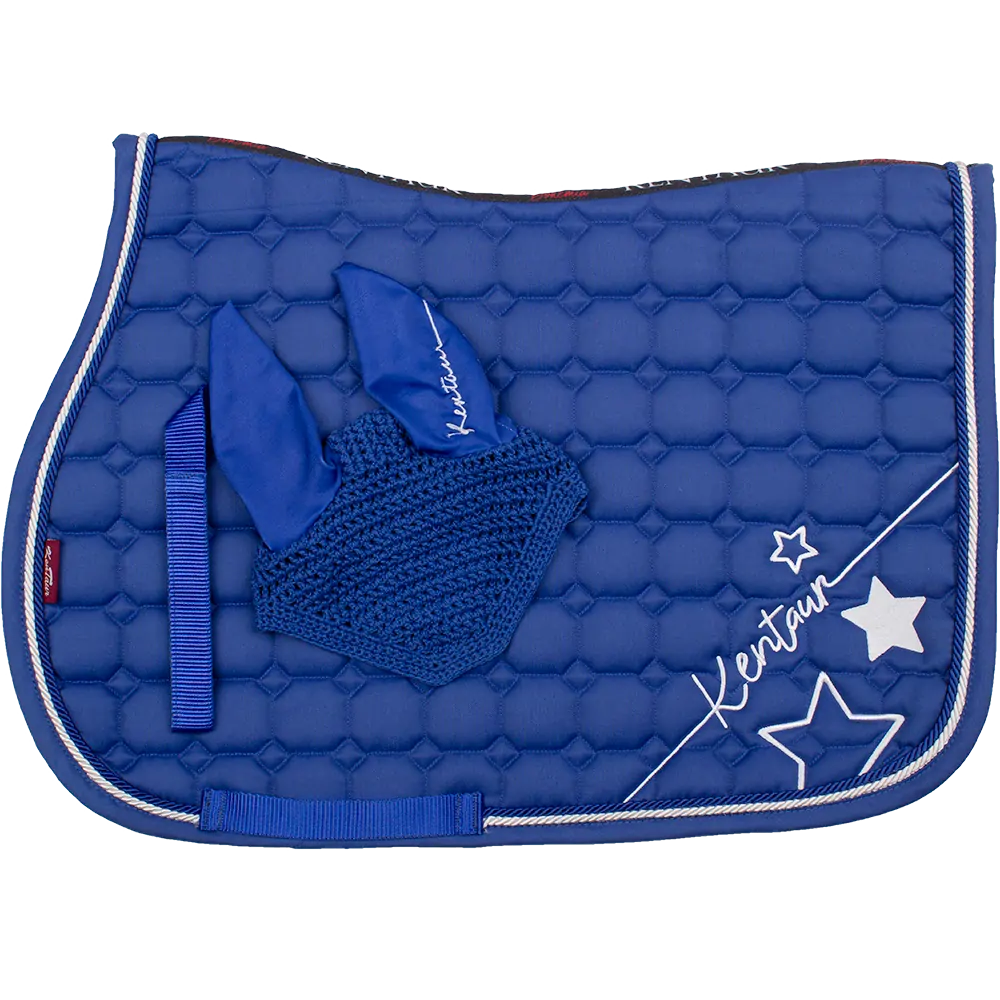 Pony skoková dečka i náušníky s logem Kentaur. Dečka olemována dvojitou kroucenou šňůrou. Spodní materiál z hi-tech materiálu, který výborně absorbuje a odvádí pot od koně.