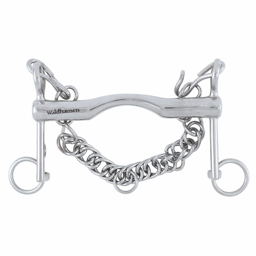 Drezurní plná páka z nerezové oceli, nelomené, anatomicky tvarované udítko. Součástí je podbradní řetízek.