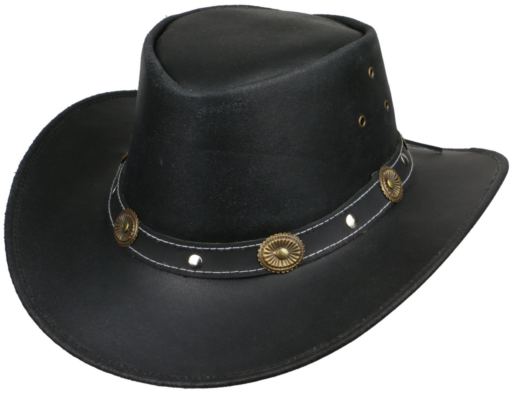 Je ozdoben conchos a páskem z pravé kůže. Má praktická očka pro snadné odvětrání v horkých dnech.