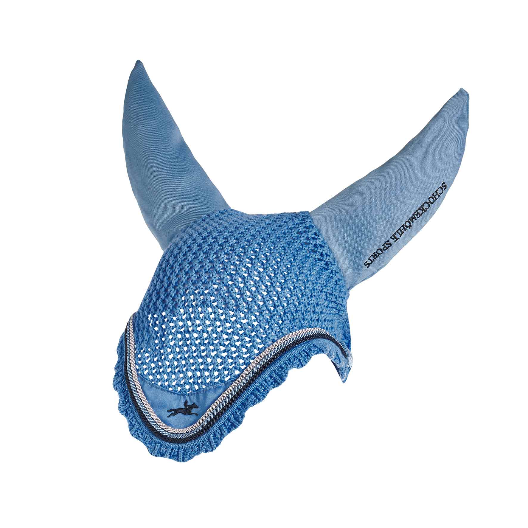 Ozdobeno třemi tenkými provazy a výšivkou na uchu.