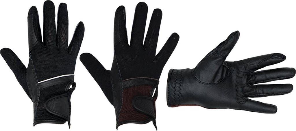 Rukavice lehké jezdecké . Vrchní materiál z prodyšné síťoviny, dlaň Serino. Barva celočerná s bílou paspulí nebo černohnědé s hnědou paspulí.