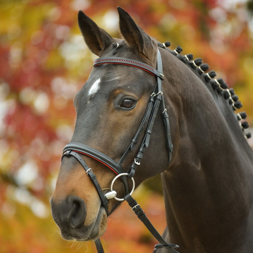 Uzdečka s anglickým kombinovaným nánosníkem, zdobená kamínky a barevným vypodložením.