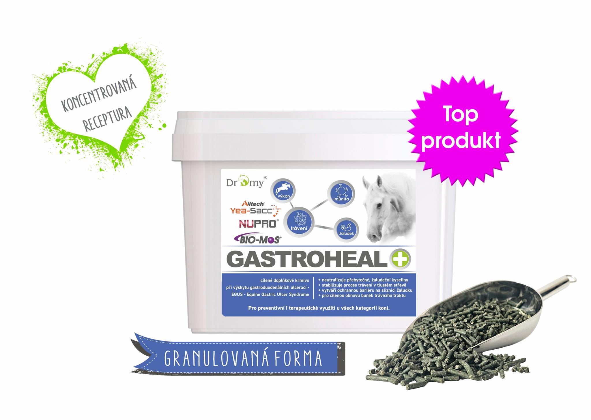 GastroHeal je komplexní, KONCENTROVANÉ GRANULOVANÉ doplňkové krmivo s nízkým alergenním potenciálem, určené pro koně s výskytem gastroduodenálních ulcerací - EGUS - Equine Gastric Ulcer Syndrome.